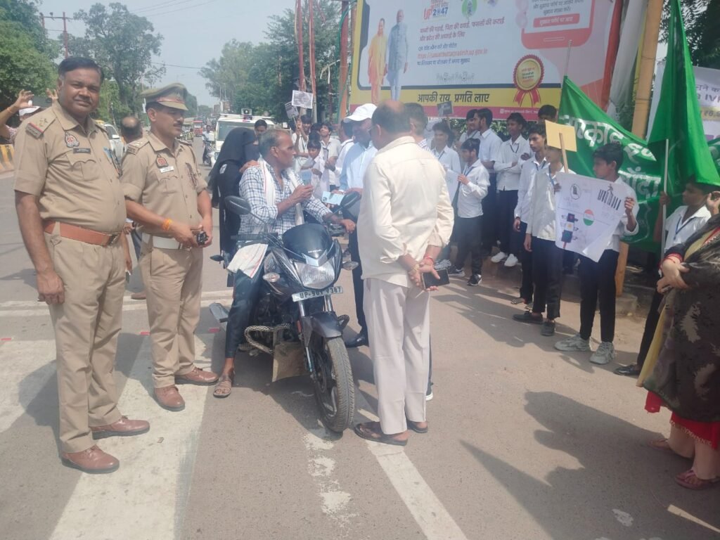 जनपद में सड़क दुर्घटनाओं को कम करने तथा सड़क दुर्घटनाओं से होने वाली अपूर्णीय क्षति को कम करने के उद्देश्य से पुलिस अधीक्षक पलाश बंसल के निर्देशन में गुरुवार को सहायक पुलिस अधीक्षक/क्षेत्राधिकारी यातायात मेविस टॉक द्वारा बाबूलाल चौराहा पर जीआईसी स्कूल के छात्र/छात्राओं के साथ आम जनमानस को दोपहिया वाहन चलाते समय अनिवार्य रुप से यातायात नियमों का पालन करने के लिए जागरुकता अभियान चलाया गया।