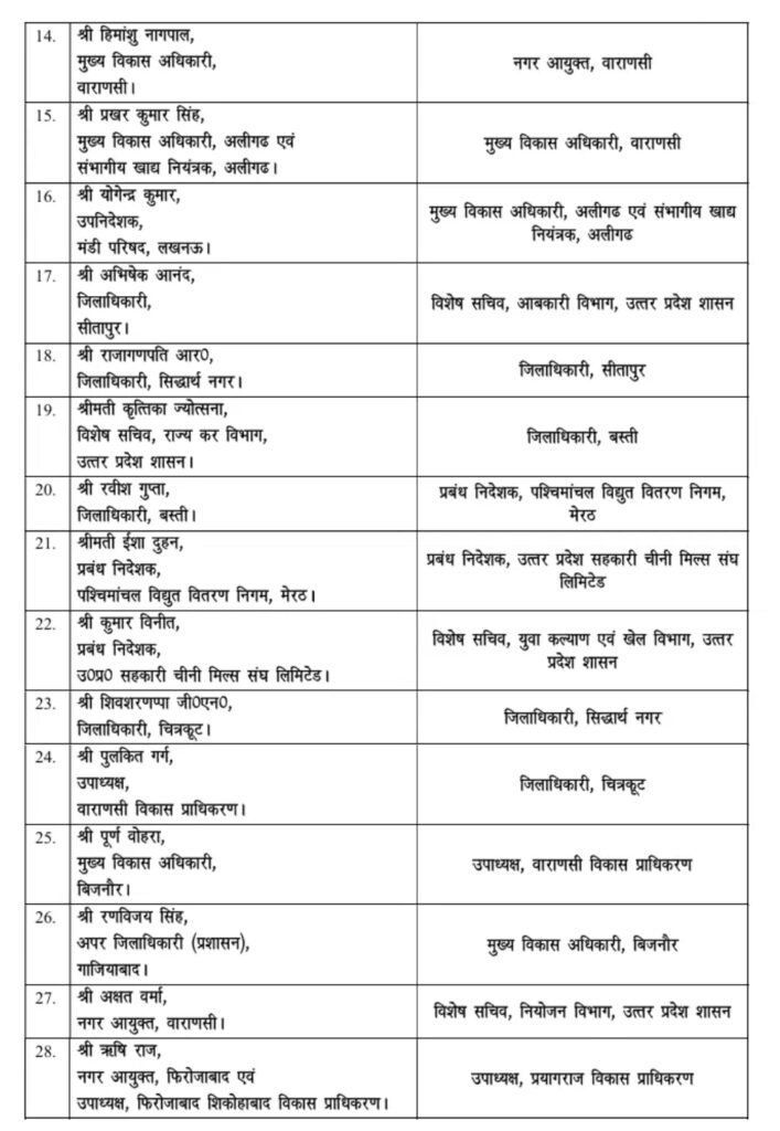 सीतापुर के जिलाधिकारी अभिषेक आनंद को विशेष सचिव आबकारी बनाया गया है। वहीं, सिद्धार्थ नगर के डीएम राजा गणपति आर को डीएम सीतापुर बनाया गया है। कौशांबी और बलरामपुर के भी जिलाधिकारी बदल गए हैं। दूसरी ओर राजेश कुमार को मिर्जापुर का नया मंडलायुक्त नियुक्त किया गया है। अन्य तबादलों में प्रखर सिंह को वाराणसी का मुख्य विकास अधिकारी (सीडीओ) बनाया गया है।