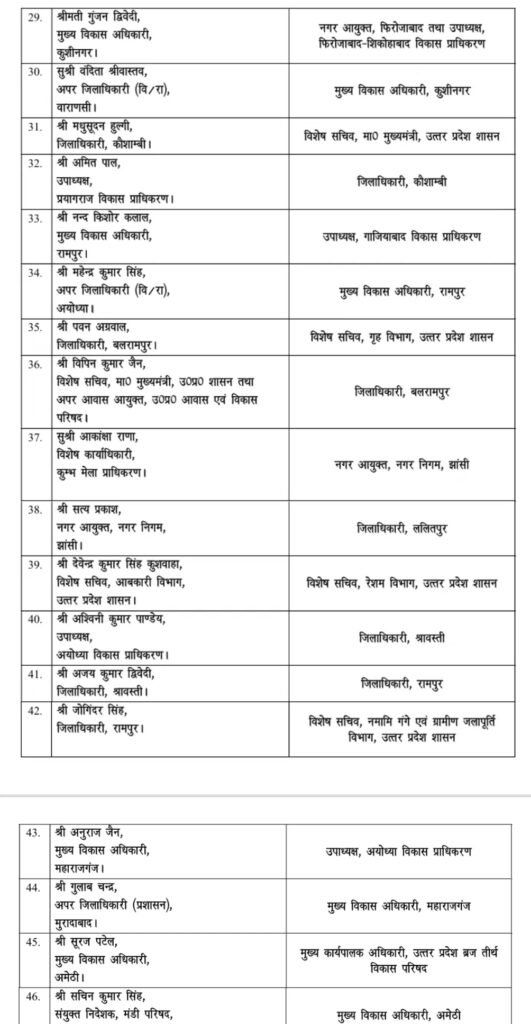 यूपी में 46 अफसरों का तबादला किया गया है। इसमें आईएएस कृतिका ज्योत्सना को बस्ती का डीएम, वाराणसी के सीडीओ हिमांशु नागपाल को वाराणसी का नगर आयुक्त बनाया गया है। वाराणसी की एडीएम वंदिता श्रीवास्तव को कुशीनगर का सीडीओ बनाया गया है। रामपुर के सीडीओ नंद किशोर कलाल को गाजियाबाद का उपाध्यक्ष बनाया गया है। मिर्जापुर के आईएएस बाल कृष्ण त्रिपाठी को सचिवालय सामान्य प्रशासन बनाया गया है। उनकी जगह राजेश कुमार की नियुक्ति की गई है।